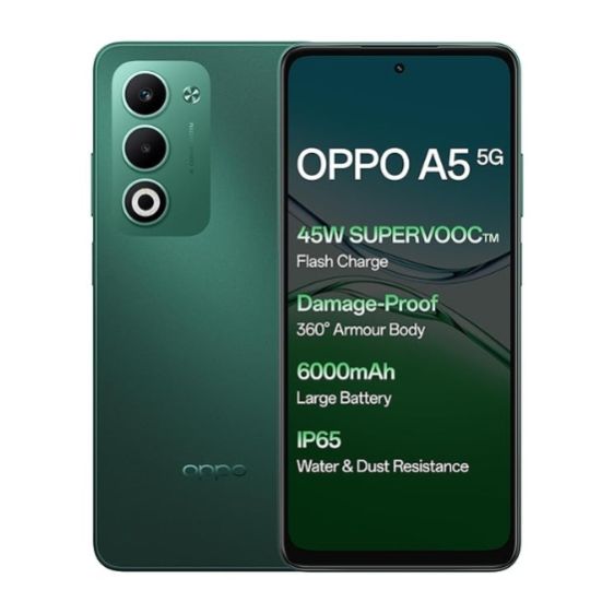 OPPO A5 5G is a budget-friendly smartphone featuring a 6.67-inch 120Hz LCD display, a MediaTek Dimensity 6300 processor, a 50MP dual rear camera system, a 6000mAh battery with 45W SUPERVOOCTM fast charging, and IP65 water/dust resistance