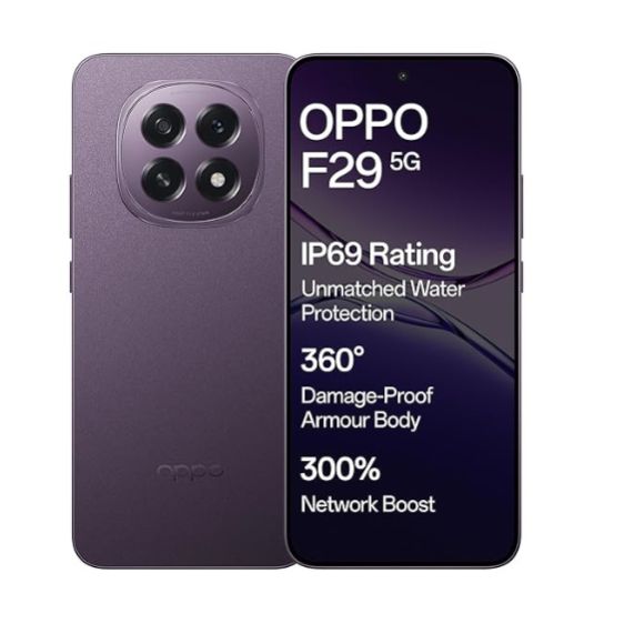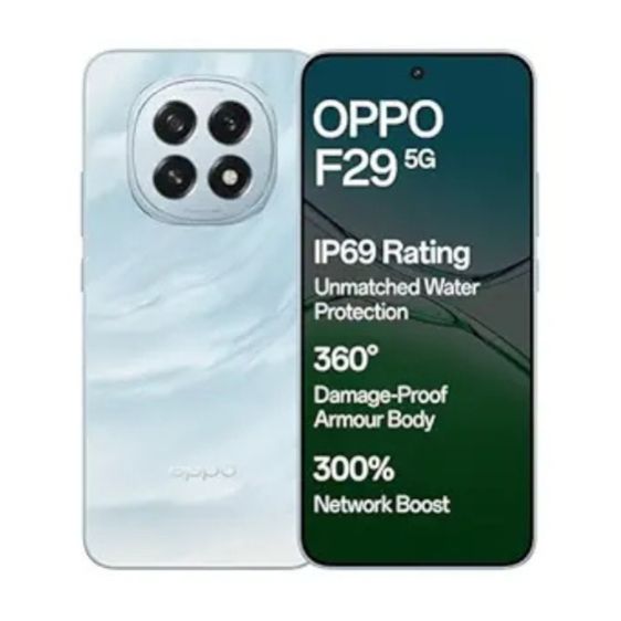 Oppo F29 5G 8GB/128GB features a 6.7-inch FHD+ AMOLED display, a Qualcomm Snapdragon 6 Gen 1 processor, and runs on Android 15. It has a 50MP + 2MP dual rear camera and a 16MP front camera. Key features include an 8GB RAM/128GB storage, 6500 mAh battery, 45W fast charging, and a notable IP69 waterproof rating for durability.