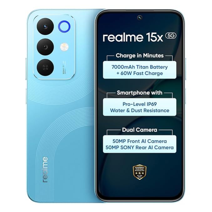 The realme 15x 5G is a smartphone featuring a MediaTek Dimensity 6300 5G chipset, a 6.8-inch 144Hz display with 1200 nits brightness, and a 7000mAh battery.