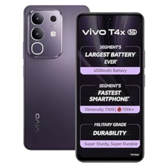 Vivo T4x 5G features a 6.72-inch 120Hz LCD display, a MediaTek Dimensity 7300 processor, and a 50MP+2MP dual rear camera with a 6500mAh battery supporting 44W Flash Charge.